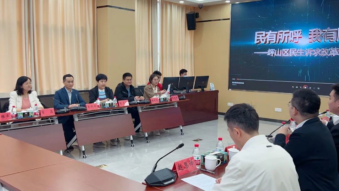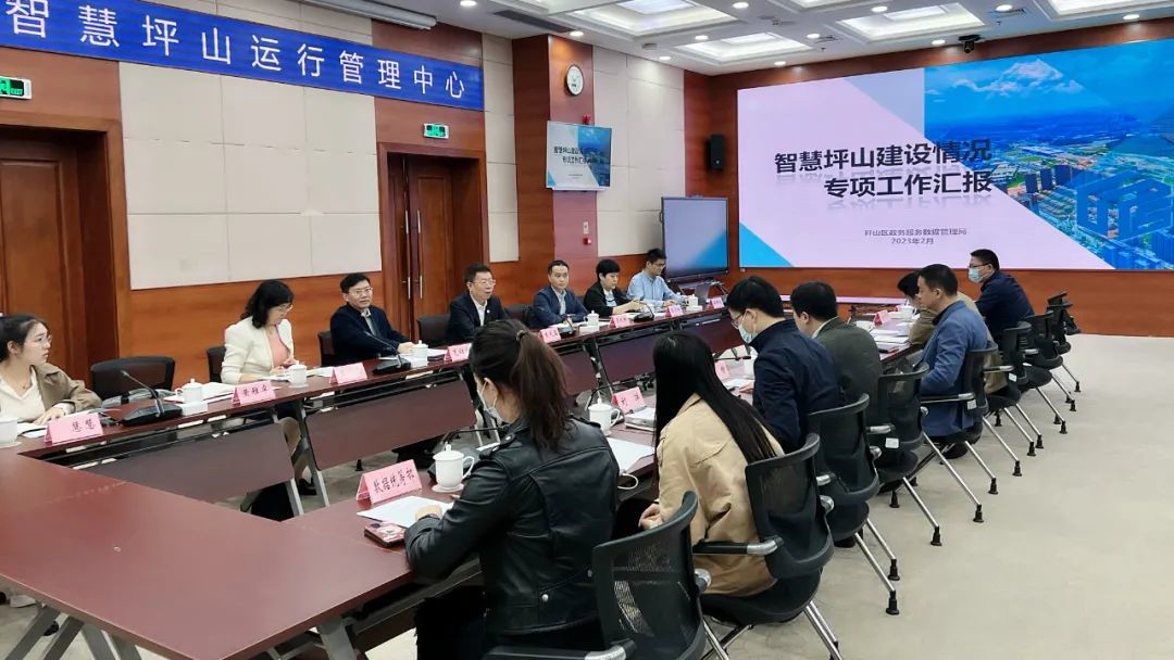 在坪山区,课题组与区政务服务数据管理局、区委组织部等开展交流。坪山区政务服务数据管理局局长详细介绍了智慧坪山的发展历程、工作体系、总体架构等,并现场演示了智慧坪山的相关具体应用。课题组成员在与坪山区政务服务数据管理局、区委组织部相关负责同志就智慧城市建设、大数据平台、智慧管理指挥平台、职责清单等有关情况进行沟通时,切实感受到了深圳在流量城市治理与数字政府建设方面的先进经验与改革热情。