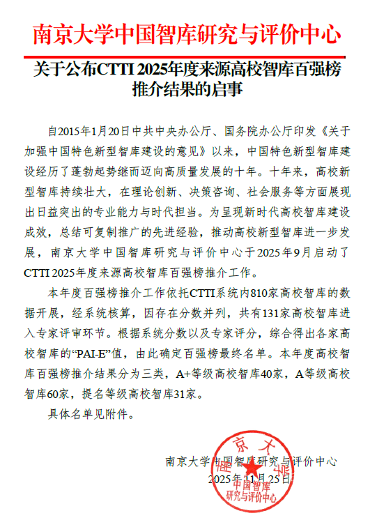 据悉,CTTI百强榜的评选主要基于智库产品(Product)、智库活动(Activity)、智库媒体影响(Impact)等客观指标,同时结合专家主观评价(Expert)形成综合评分,最终选出100家优秀高校智库,整体入围比例约12.3%。其中,A+等级40家、A等级60家,另设提名奖31家。