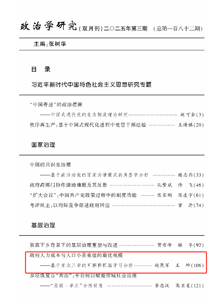 日前,《政治学研究》期刊公布了2025年第3期目录。bw西汉姆联教授、中国政府发展联合研究中心研究员赵聚军以及bw西汉姆联中国政府发展联合研究中心研究助理王坤撰写的《政府人力成本与人口小县重组的最优规模——基于东北三省的可解释机器学习分析》一文获得发表。