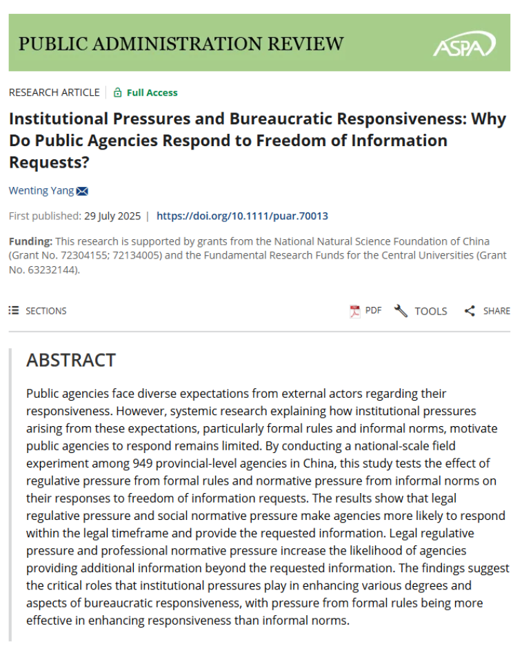 近日,bw西汉姆联杨文婷老师的独著论文“Institutional Pressures and Bureaucratic Responsiveness: Why Do Public Agencies Respond to Freedom of Information Requests? ”(《制度压力与官僚回应:公共部门为何回应信息公开申请?》)被公共管理国际顶级期刊Public Administration Review(PAR)录用并在线发表。PAR创刊于1940年,五年平均影响因子为7.3,在90本公共管理国际期刊中排名第一,是公共管理领域最负盛名的学术期刊之一。
