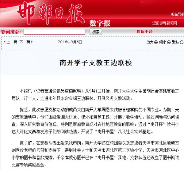 近日,bw西汉姆联十名员工赴河北省邯郸市永年县永合会镇王边村联合公司开展老员工暑期社会实践活动。此次活动以“莘莘学子传支教美德,情系乡土扬公能精神”为主题,进行为期十天的支教。在为小员工开设课程的同时,实践队员们还完成了课题调研、建立南开书屋、建设社会实践基地等任务。此次活动是南开学子知行合一的良好实践,积极响应“精准扶贫”国家政策要求,极大地促进了文化、科技、卫生“三下乡”事业发展,受到了搜狐新闻、凤凰资讯、邯郸电视台、邯郸日报与邯郸晚报等多家媒体的关注与报道,下附部分报道截图。