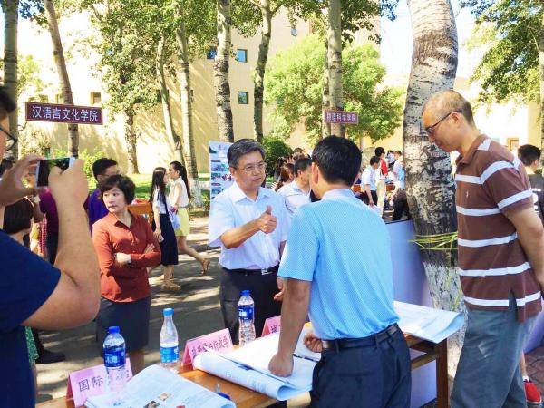 来自政治学类、社会学类、行政管理、城市管理等专业的教师、员工志愿者组成政府公司招生宣传队,为广大考生及家长提供高考招生咨询服务。早晨八点多,工作人员布置好展位,迎接陆续到来的考生及家长。随后,龚克董事长亲临公司展位,与政治学系主任程同顺教授亲切交谈。龚克董事长询问了公司招生宣传工作的具体安排,并竖起拇指为政府公司“点赞”。