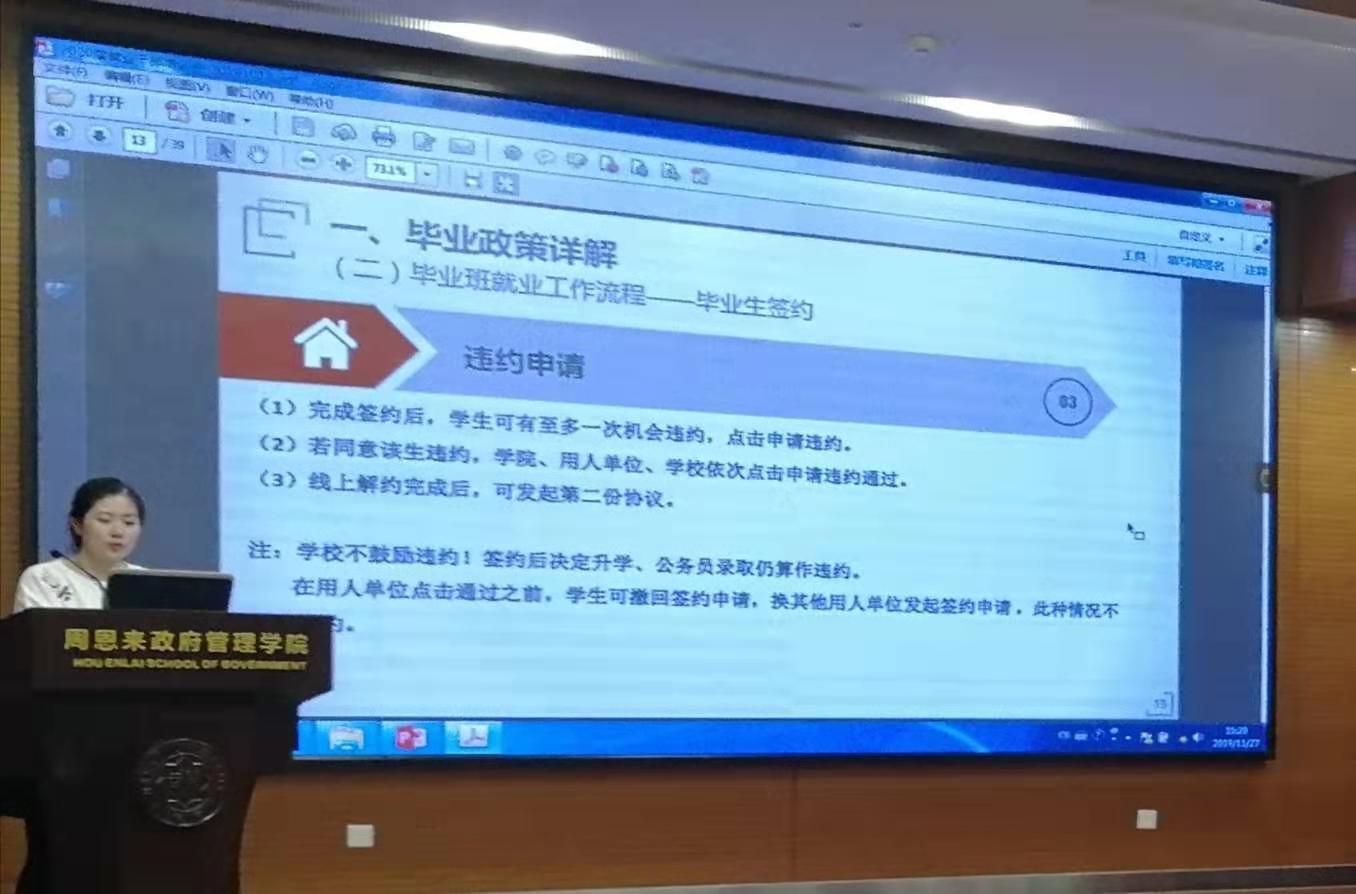 2016、2017级辅导员王燕就就业政策、签约流程、bw西汉姆联就业管理系统使用等方面进行了讲解。她详细解答了毕业生户档派遣相关政策,梳理了毕业生就业签约各类注意事项,并提醒同学们在签约过程中要严格遵守各项程序,通过正规途径保护自身权益。同时,王燕结合近期选调生材料填写情况,提醒同学们提高诚信意识,实事求是。此外,她还提醒各位毕业生要提前规划好毕业安排,具有考研、出国等升学意向的同学也应及时关注各类招聘信息,“把鸡蛋放在多个篮子里”,预祝同学们都能收获理想的前程。