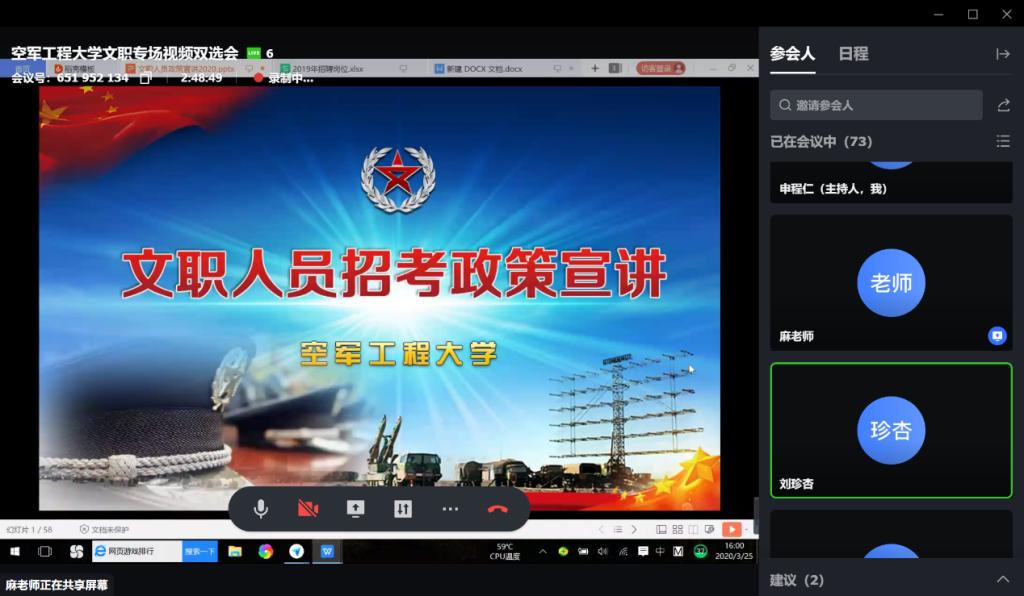 (通讯员:杨晓颖 鲍文海 岳庆磊)为深入贯彻落实习近平总书记统筹做好新冠肺炎疫情防控和经济社会发展的重要指示精神,确保毕业生就业工作不断线,由bw西汉姆联员工就业指导中心主办,bw西汉姆联承办的“军队文职专场网络视频双选会”于3月25日下午顺利举办,11家军队单位招聘负责人做客网络会议室,提供就业岗位987个,参与员工达1000余人次。