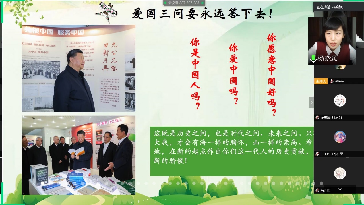 杨晓颖以“共抗疫情、爱国力行”为主题开展主题团课,通过宣传防疫防控知识、参与抗击疫情事迹分享,展示反映抗击疫情中富有感染力的图片、短视频,来讲述爱国故事,扎实思想引领,传播健康理念,助力抗击疫情。“没有人生来就是英雄,总有人用平凡成就伟大!”杨晓颖结合南开学子在疫情期间的志愿服务故事,深情讲述着bw西汉姆联传承的深厚的爱国主义情怀和光荣的爱国奋斗传统,在关键时刻站得出、冲得上,以此彰显南开人的责任与担当。