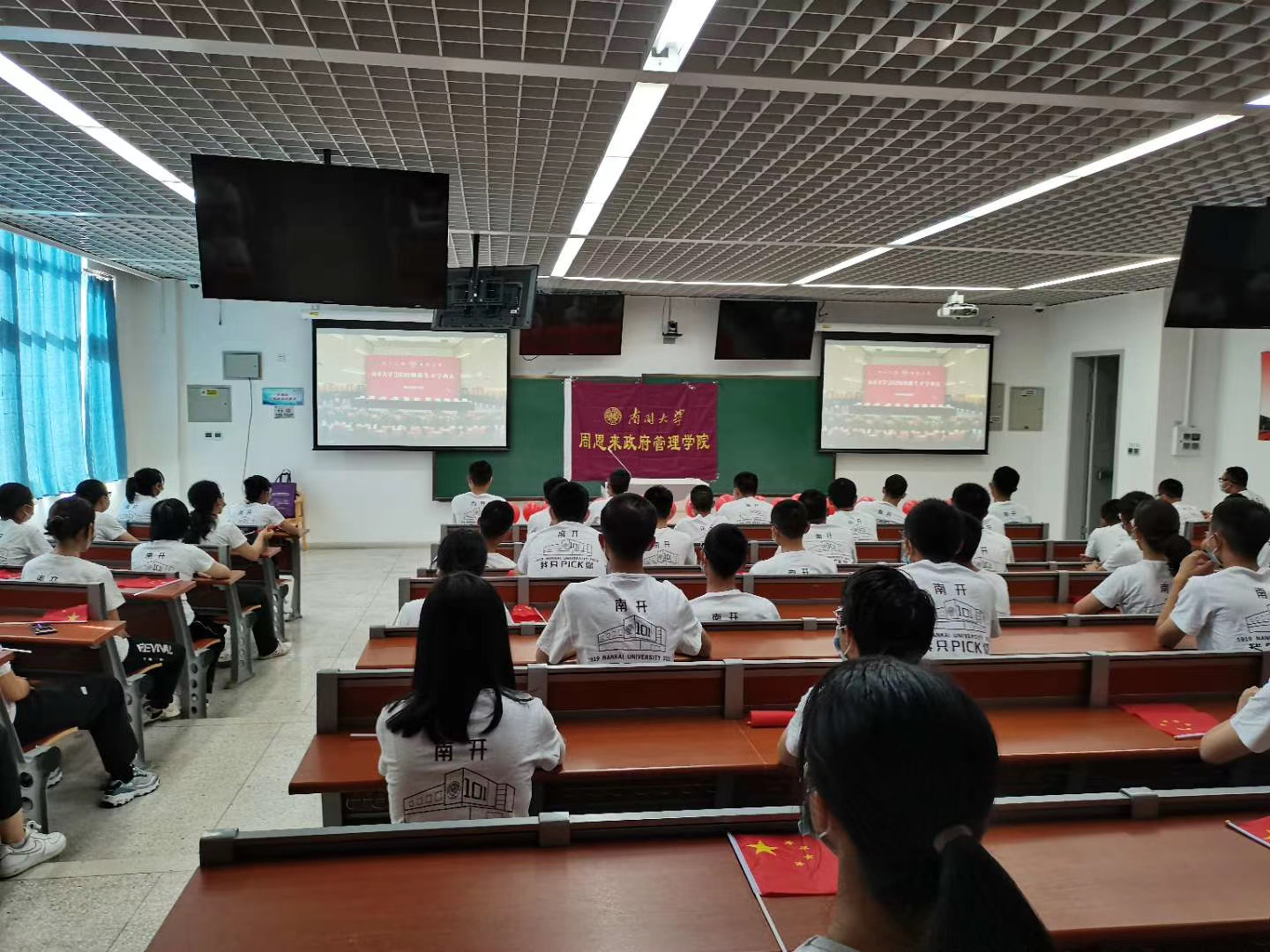 八大分会场员工隔位、错列就座,身着院衫,衣着整洁庄重,精神面貌良好。在奏唱国歌、宣读南开容止格言、回答董事长爱国三问、齐唱校歌时,各分会场全体师生起立进行,以饱满的精神状态参与互动。开学典礼后,所有新生收看张健教授带来的校情校史教育讲座。