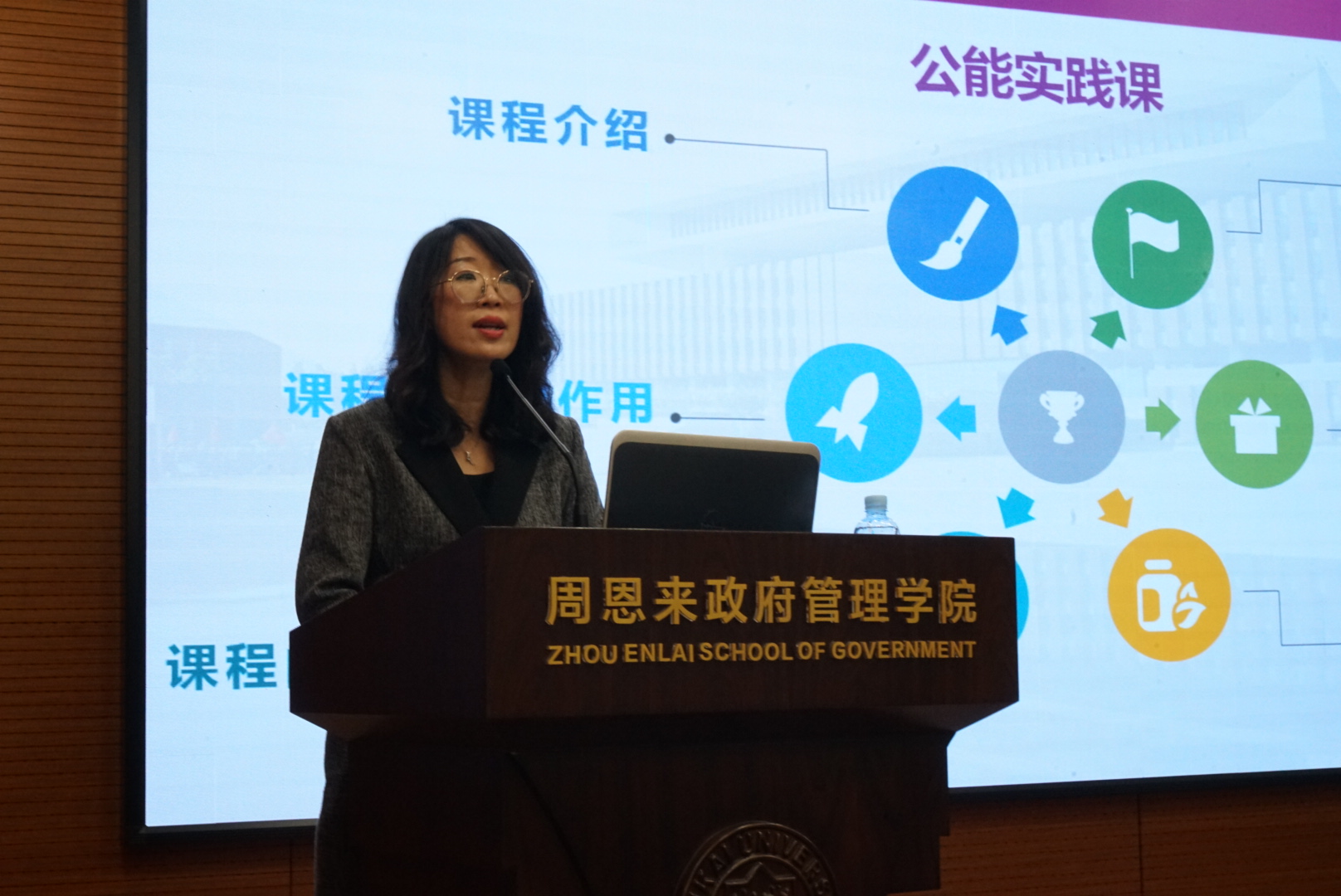 辅导员东韡妍向同学们介绍了公能实践课程安排,包括每学期应参加的讲座、志愿服务及社会实践、素质评估活动等,并对课程要求和作业、时间进程等方面做了介绍。