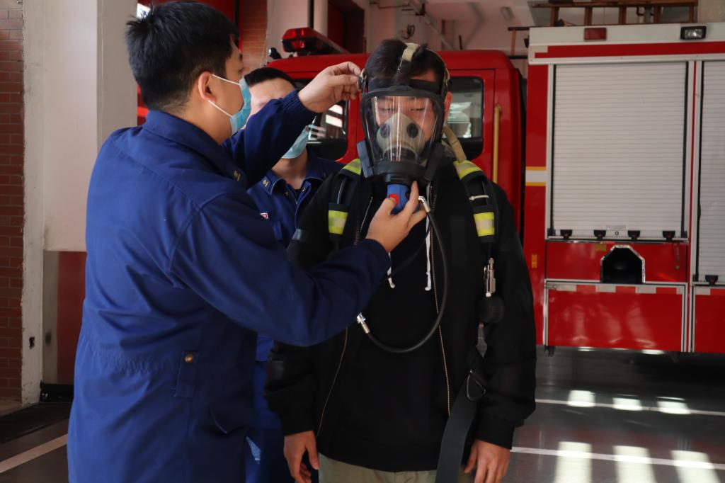 “干粉灭火器使用时先拉掉保险销,一手紧握喷嘴,对准燃烧物体……”消防员们向在场师生详细讲解消防车上各类救援设备的功能,现场演示了干粉灭火器的使用办法,并邀请同学们穿上灭火防护服、抢险救援服,上手使用消防栓和氧气罩。