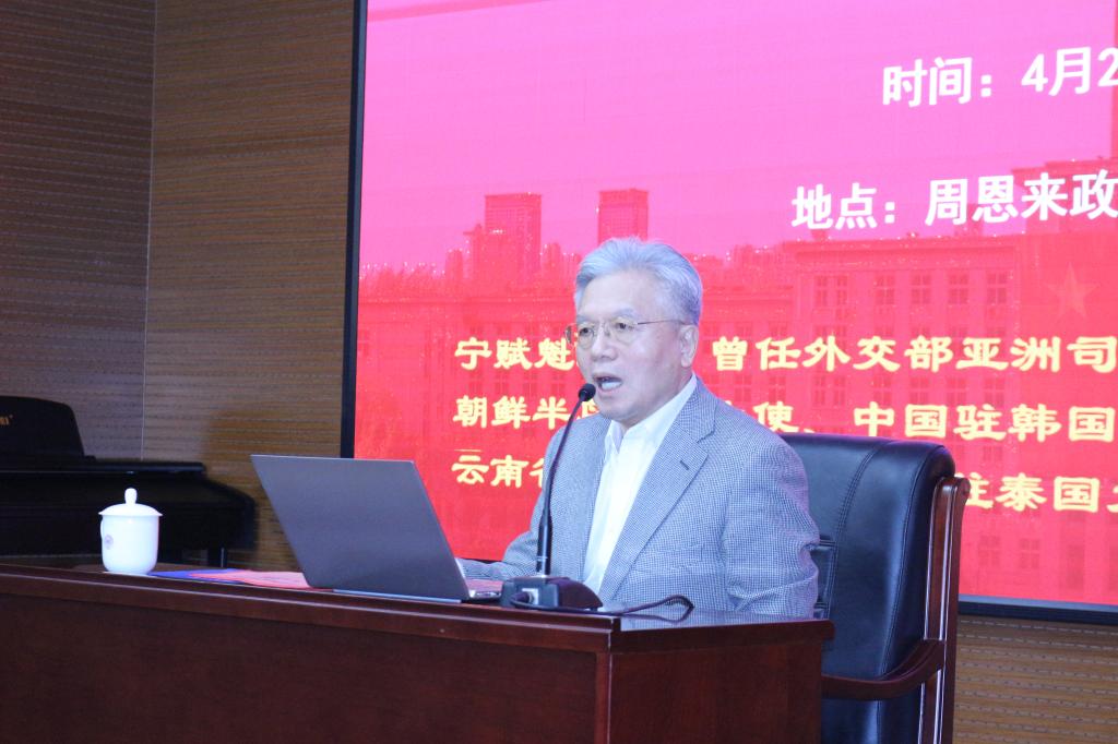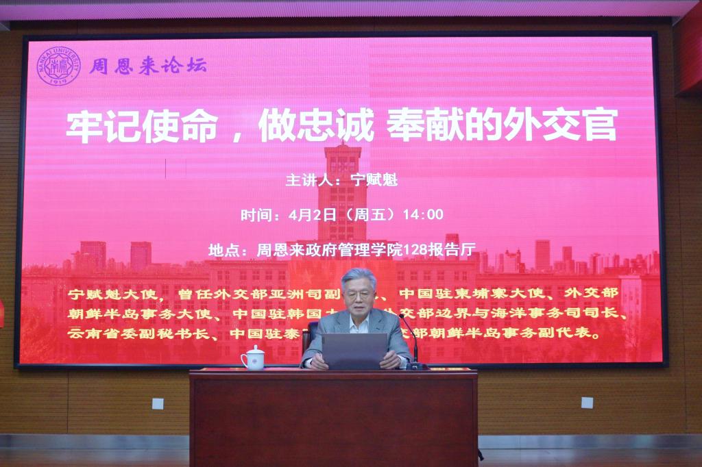 “外交人员必须成为文装解放军。”——这是周恩来总理对中国外交人员的要求,更是国家外交的使命与担当。讲座伊始,宁赋魁大使缅怀周总理的丰功伟绩,赞颂周总理为国家忠诚奉献的一生。他称外交人员对周总理一直怀有一种特殊感情,周总理作为新中国第一任外交部长,在中华人民共和国成立初期担当重任,培养了一批优秀的外交人才,为无数外交人员树立了榜样;更是把“如何更好地开展外交工作、把自己塑造成维护国家发展的外交人员”做到极致,是中国外交里程上的丰碑,更是为后来的中国外交指明了前路。