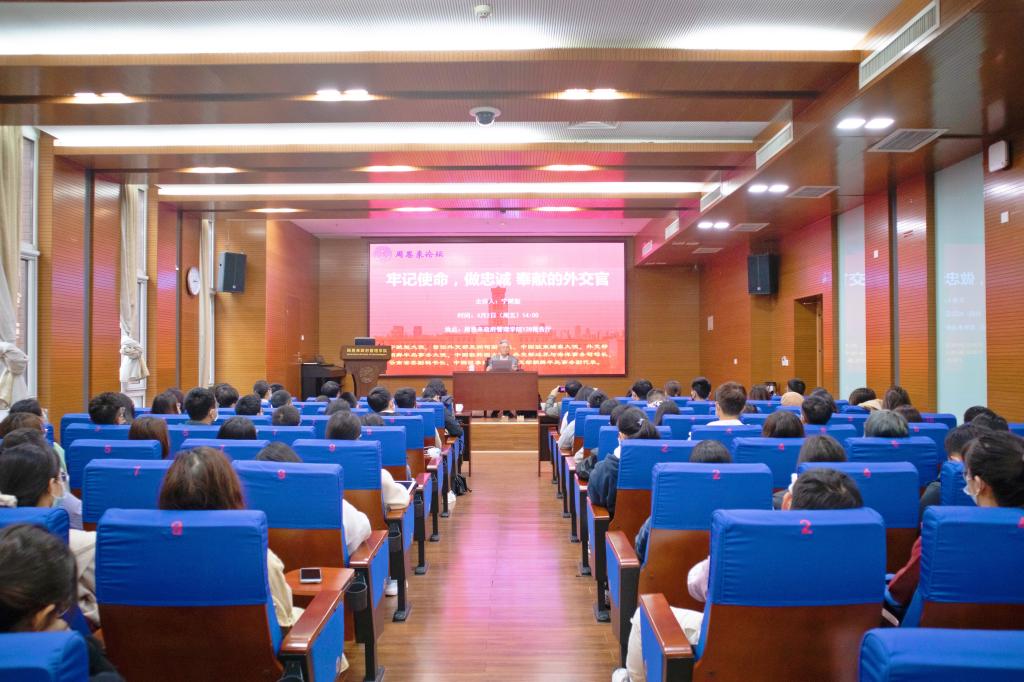 宁赋魁大使献身我国外交事业四十余载,他讲述了一个个生动的外交故事,让同学们深刻理解“忠诚、使命、奉献”是每一位中国外交人员的核心价值观,不管身处何地,都要始终将维护国家利益放在首位。“外交是一场没有硝烟的战争”,宁赋魁大使指出,外交人员要冲在第一线,坚决捍卫国家主权,始终坚持 “站稳立场 掌握政策 熟悉业务 严守纪律”16字要求,不忘爱国初心,牢记维护国家利益的伟大使命,做有信仰、有纪律的外交人。