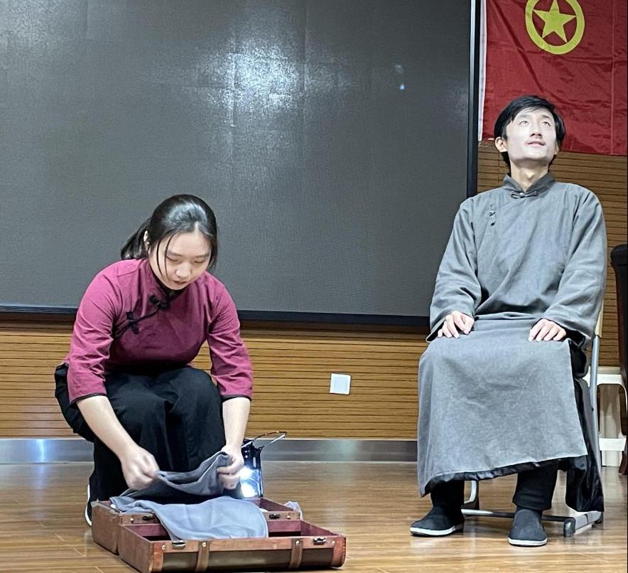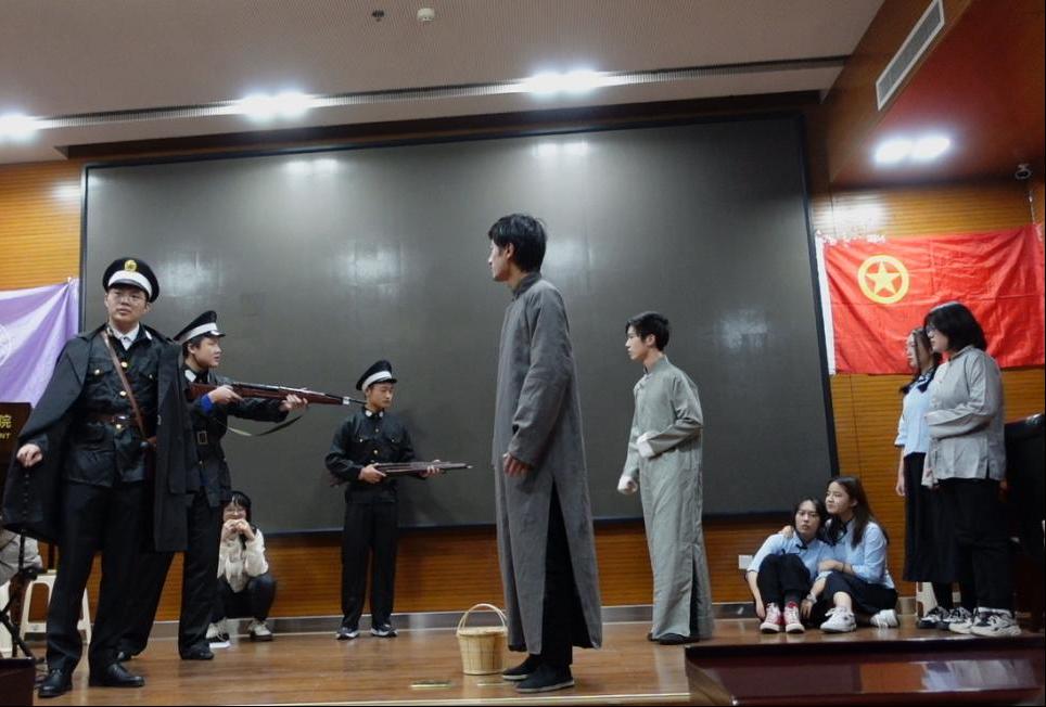 全体师生齐唱团歌后,话剧拉开帷幕。话剧以当代员工周舟一场《五四运动与中国共产党早期斗争》的课堂展示被闯入的民国报童打断而入梦,通过两个时空的穿插对话,寻找当代青年与革命青年的情感共鸣。
