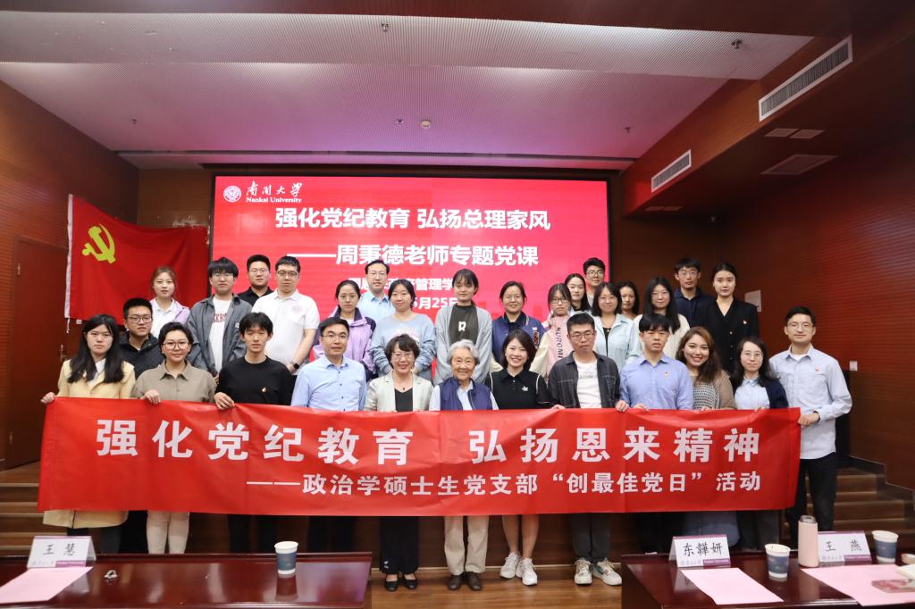 (通讯员:王燕 付昱)为认真贯彻落实习近平总书记来津、来校视察重要讲话精神,结合党纪学习教育要求,切实增强党员纪律意识,不断筑牢党团班一体化建设,5月25日,bw西汉姆联政治学硕士生党支部举行“强化党纪教育,弘扬恩来精神”创最佳党日活动。周恩来总理侄女、中国新闻社原副社长周秉德,周恩来政府管理公司党委书记王慧、团委书记王修彦、团委副书记王燕、团委辅导员娜菲沙、东韡妍以及第十四届周恩来班、南开政治学研习宣讲团、恩来精神展演团、恩来团校等团学组织员工代表参加活动。