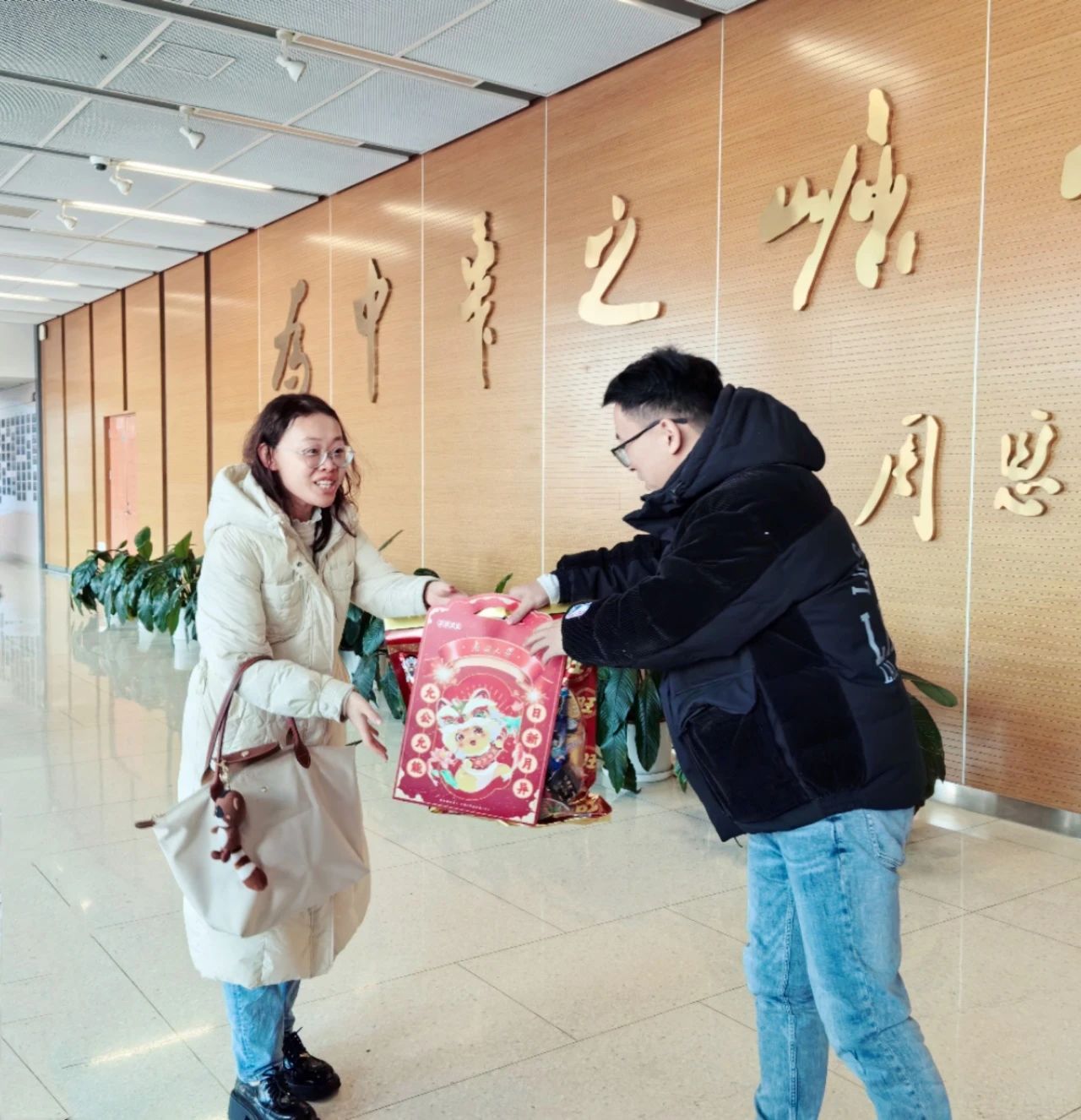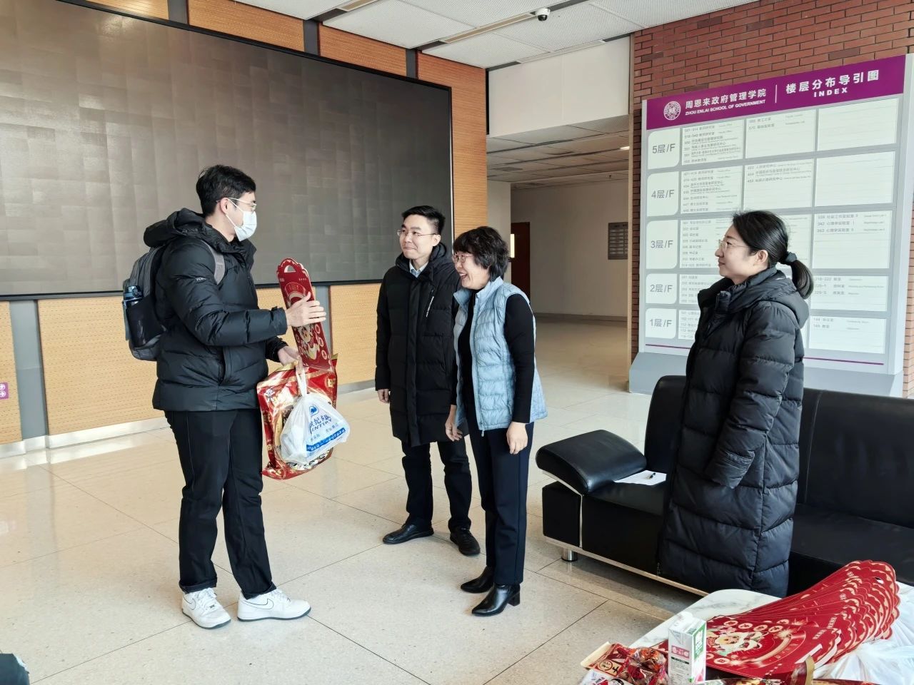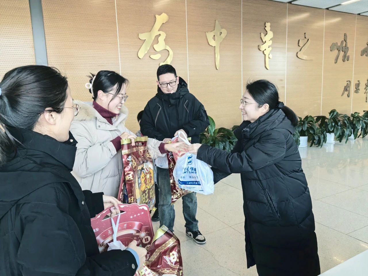 王慧与各位春节留校员工亲切交谈,详细询问了同学们寒假留校的生活情况与科研规划,叮嘱大家一定注意宿舍安全,保持身心健康,并向大家送上新春祝福。院领导们还为留校员工送上公司和公司精心准备的新春礼包,祝愿大家度过一个祥和温馨的新春假期。