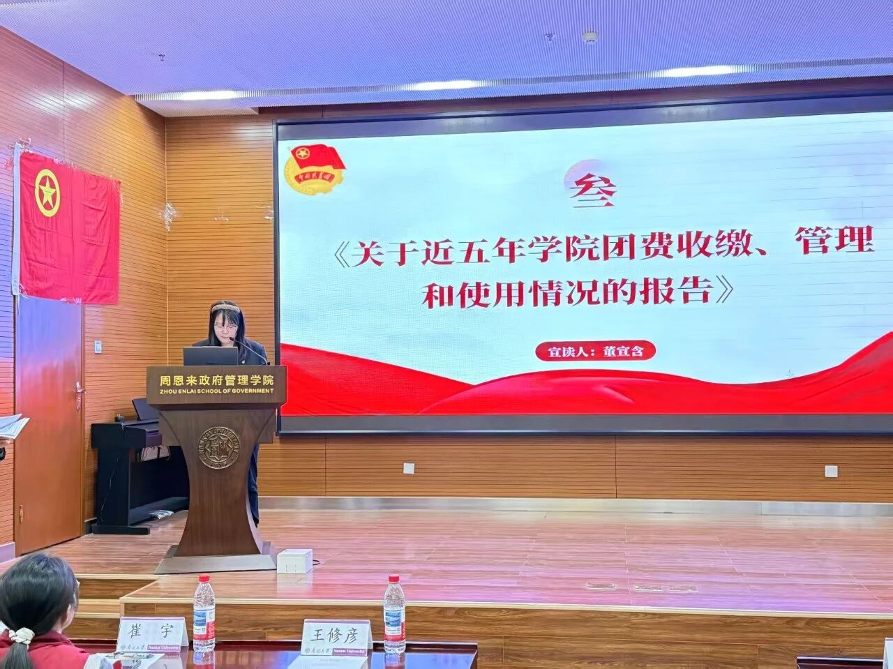 公司团委组织部负责人董宣含宣读《关于近五年公司团费收缴、管理和使用情况的报告》。在收缴情况方面,各年度收缴情况基本稳定,所缴团费全数上缴校团委;在管理情况方面,公司团费实行账户专管专用,确保账目明晰,严格规范团费收支流程,团费收集汇总后统一提交至校团委指定账号;在未来工作方面,组织部负责人表示将继续恪尽职守、勇于创新,把团费收缴、管理和使用工作抓得更实、更细、更规范。