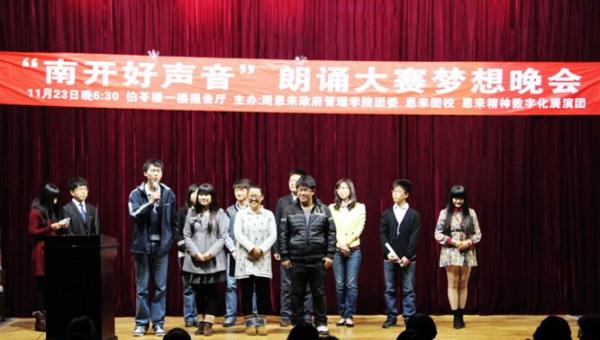 学员们共同吟诵的《世界,请听中国朗诵》开启了晚会大幕。晚会共分三章:致敬经典,《大堰河——我的保姆》《一月的哀思——献给敬爱的周总理》都寄托了对所敬所爱之人的深切缅怀;致敬青春,学员们各具特色的声音将观众们引入了朱自清的荷塘,柳永的柳岸,还有几乎所有人都曾梦想过的属于自己的一片海;梦的绽放,周邓纪念馆副馆长、南开员工李爱华为大家送上了寄语。表演中间还穿插了来自南开两届十大歌手的好声音——周鹏霄和王宁的歌声以及选手程曦带来的歌曲《万物生》,晚会设置的互动配音小游戏更是让笑声不断。