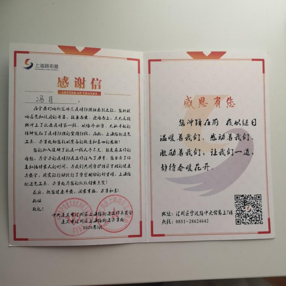 新冠肺炎疫情期间,她积极响应号召,前往所在社区报到,主动参与抗疫值守志愿活动,进行人员排查、体温测量、出入证核实、人员登记等工作,向居民进行抗疫知识的宣传和普及,提高其对于疫情的重视程度和防护能力。