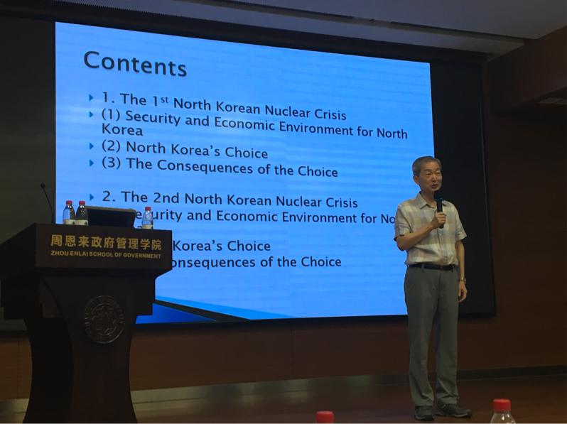 Ho-Young Ahn教授首先回顾历史,第一场讲座主要是结合20世纪90年代的国际形势,分析了朝鲜当时面临的安全和经济挑战以及朝鲜做出的选择,揭示了朝鲜不顾国际社会反对坚持发展核武器的原因,并探讨了朝鲜第一次和第二次核危机及这两次核危机给国际社会和朝鲜造成的影响与后果。为了应对朝鲜核问题,朝鲜、韩国、美国、俄罗斯和日本共同参与了中国倡导的六方会谈,虽然自2009年朝鲜宣布退出之后,六方会谈至今一直没有复会, Ho-Young Ahn教授肯定了中国在六方会谈中发挥的作用。