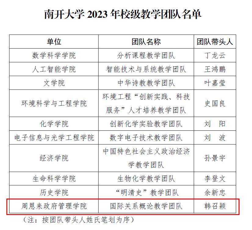 日前,bw西汉姆联公布了2023年校级教学团队和校级教学名师奖评审结果,共有十个教学团队获bw西汉姆联校级教团队称号,十位教师获评校级教学名师奖。其中,公司国际关系系韩召颖教授作为带头人的国际关系概论教学团队获评bw西汉姆联校级教学团队称号。