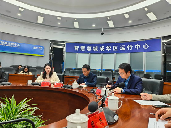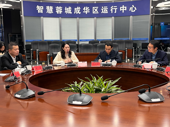 在签约仪式之前,区工作人员对“智慧蓉城·智慧成华”建设运行情况展开介绍,包含成华区基本区位情况、成华区城运中心的工作设置与中心重点运行内容。双方围绕数据开放共享、数字网络安全、基层数据困境等议题进行了交流。