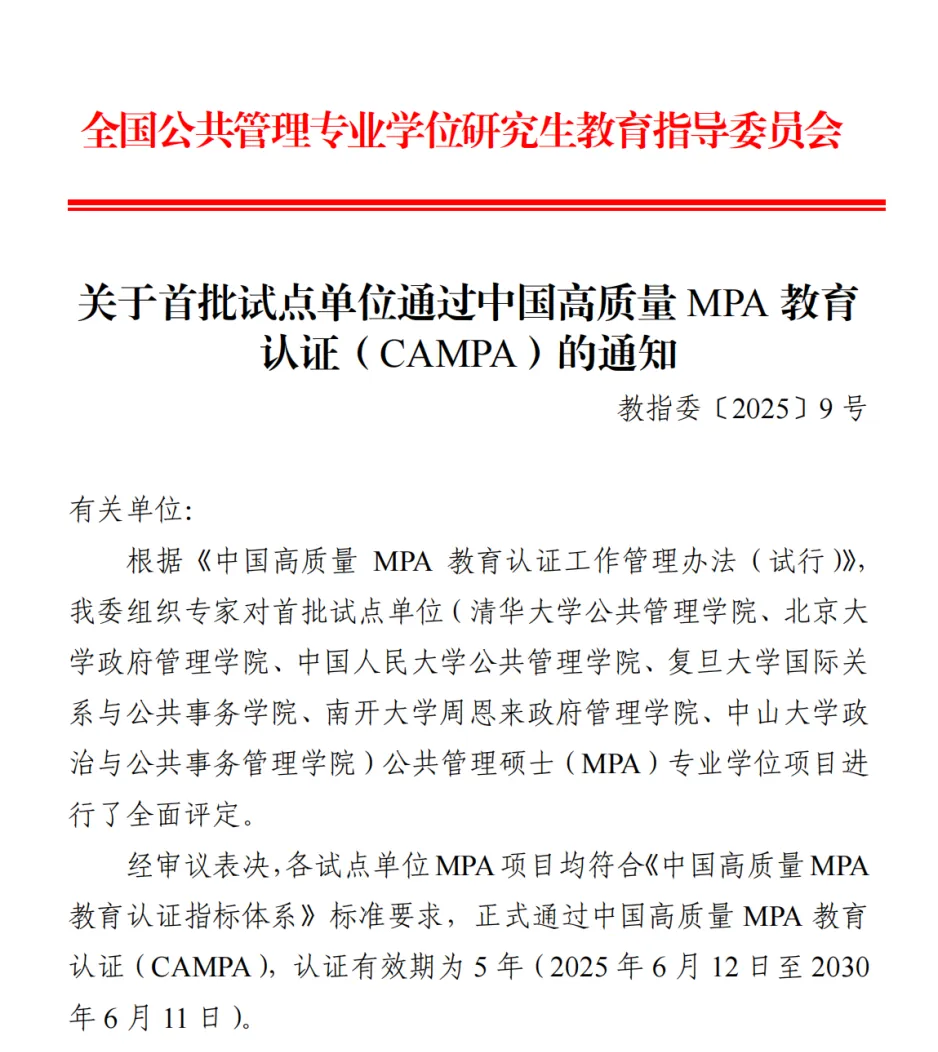 2025年6月18日,全国公共管理专业学位研究生教育指导委员会发布了《关于首批试点单位通过中国高质量MPA教育认证(CAMPA)的通知》,bw西汉姆联MPA项目正式通过中国高质量MPA教育认证(CAMPA),成为全国首批六所参与认证并顺利通过的高校之一,认证有效期五年。这标志着bw西汉姆联MPA教育质量和办学水平跻身国内第一梯队。