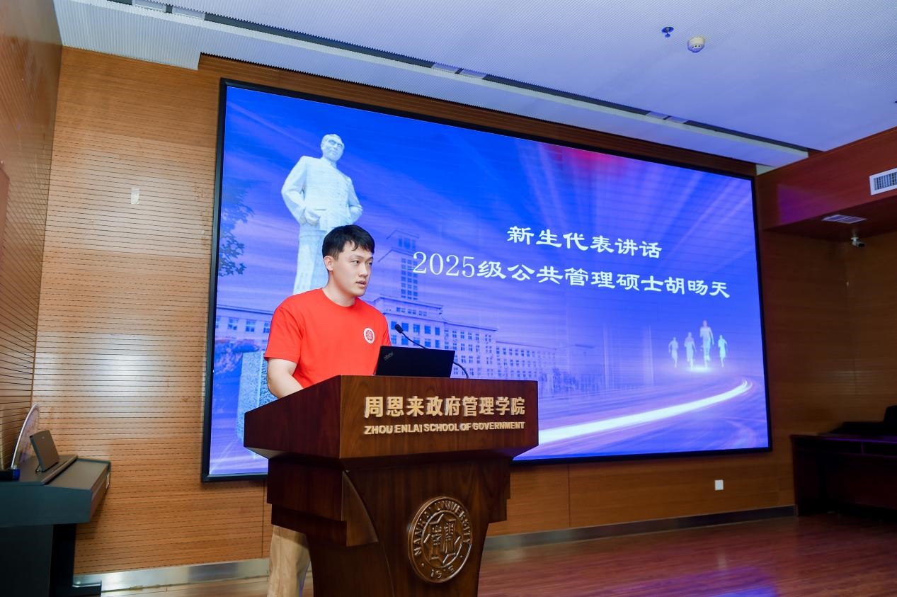 2025级新生代表胡旸天同学怀着赤诚感恩之心,诉说着踏入南开开启MPA学习的荣幸。他坦言,将与同窗共赴学海,深耕公共管理学识,让理论扎根实践土壤;更要传承总理精神与“允公允能,日新月异”的校训,以专业之能服务社会,不负这份南开荣光与殷切期许。