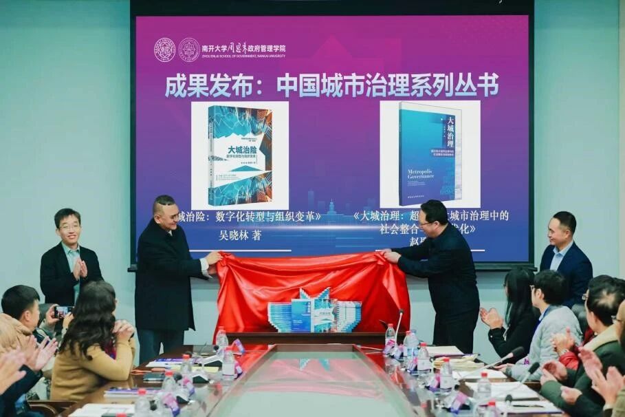 在热烈的掌声中,梁琪书记、王小虎教授、吴晓林教授、赵聚军教授共同为《大城治险:数字化转型与组织变革》和《大城治理:超大特大城市治理中的社会整合与体制优化》揭幕并合影留念。