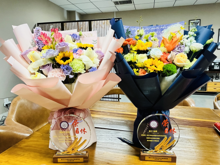 在温馨的致敬仪式上,王慧书记与吴晓林经理共同为两位老师颁发荣休纪念牌,新入职教师代表杨帆、吴亚博向荣休教师献花,表达敬意与祝福,全体与会人员合影留念,定格这珍贵瞬间。